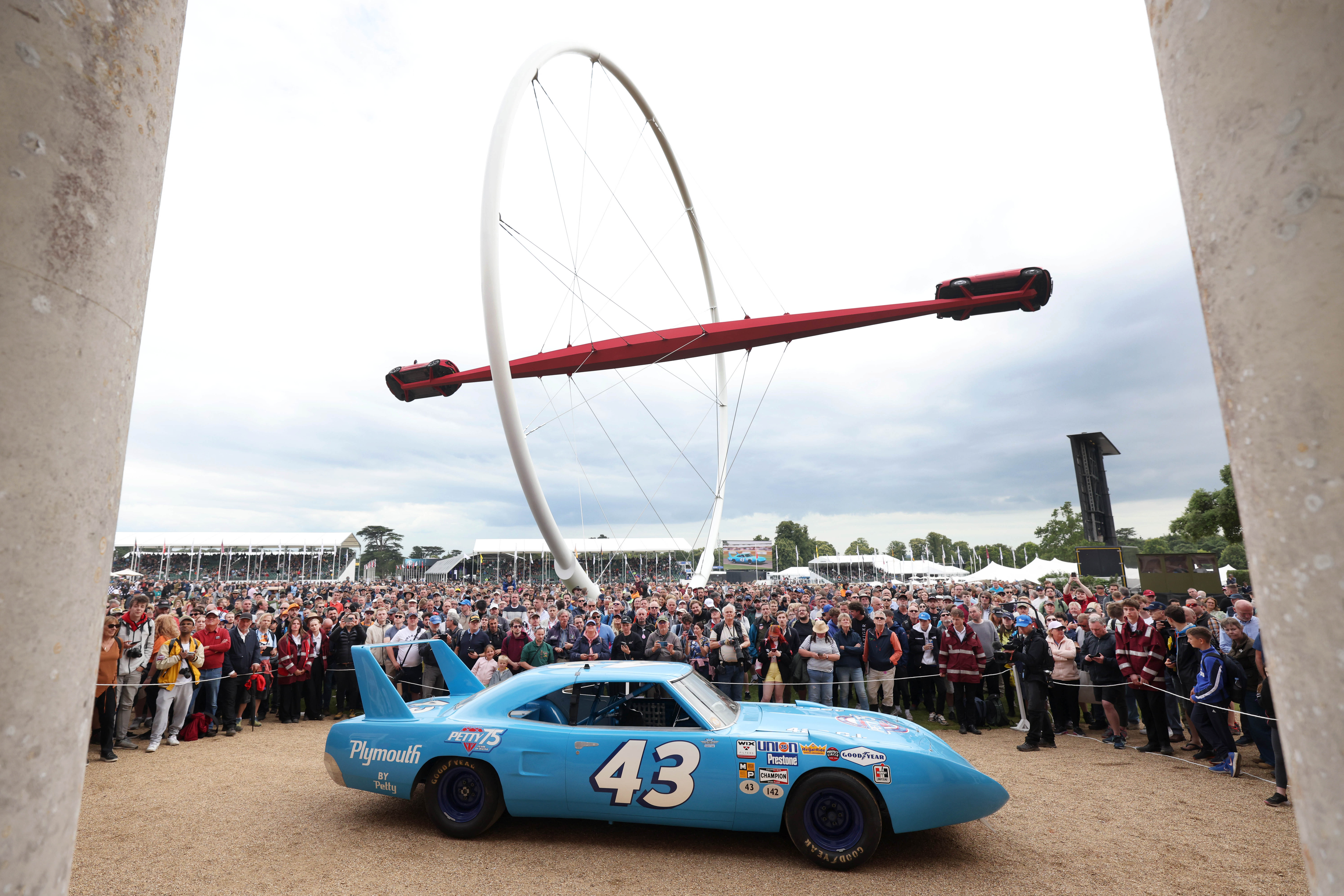 The event celebrated the centenary of MG featuring a sculpture in front of the manor featuring one of the British marque’s mid-1960s sports cars and a current day iteration by its now Chinese owner.